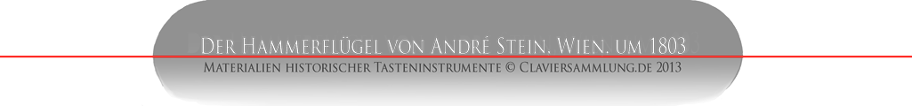 vorläufige Beschreibung des Instruments: Der prächtige Hammerflügel von André Stein, Wien nach 1802 ist nach bisherigen Erkenntnissen ª wohl das früheste erhaltene Instrument des Meisters. Es weicht in Ausstattung und Bauweise von den bisher bekannten Modellen ab und steht mit den ganz frühen Fortepianos seiner Schwester Nannette Streicher noch ganz in der Augsburger Tradition des Vaters Johann Andreas Stein. Das Instrument wird derzeit restauriert und wird danach die Sammlung des Claviersalons spektakulär bereichern.... a) eine vorläufige Chronologie der erhaltenen André Stein- Hammerklaviere hat Roland Hentzschel recherchiert in: "Das Wiener Klavier bis 1850" Hans Schneider, Tutzing 2007, S 97 . Klaviaturumfang: FF – f4